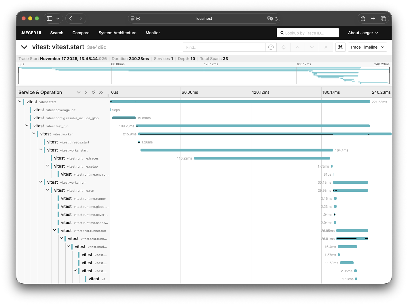 To generate traces, run Vitest as usual. You can run Vitest in either watch mode or run mode. Vitest will call sdk.shutdown() manually after everything is finished to make sure traces are handled properly.